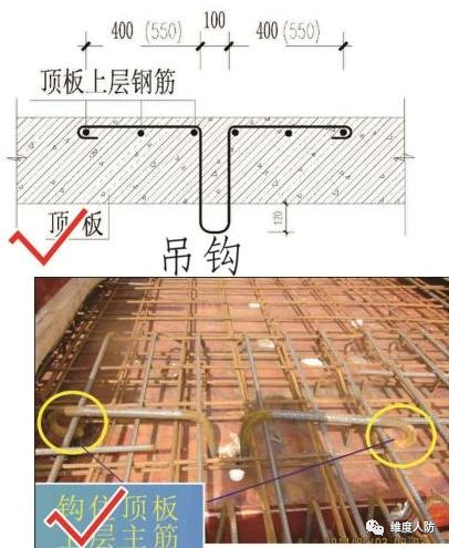 a.設(shè)備吊環(huán)勾住頂板的上層鋼筋網(wǎng)(正確做法):