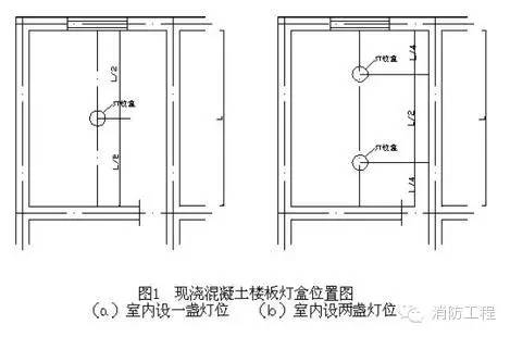 ⑴在配管前應(yīng)按設(shè)計(jì)圖紙確定好配電設(shè)備、各種箱、盒及用電設(shè)備位置。在樓板內(nèi)配管時(shí),在土建摸板支設(shè)完畢后,根據(jù)設(shè)計(jì)圖紙?jiān)诿迳嫌眉t油漆標(biāo)注燈具、插座、探測器、接線盒、配電箱的位置。當(dāng)室內(nèi)只有一盞燈時(shí),其燈位盒應(yīng)設(shè)在縱橫墻(或梁)凈尺寸中心線的交叉處;有兩盞燈時(shí),燈位盒應(yīng)設(shè)在短軸線墻(或梁)凈尺寸中心線與長軸線墻(或梁)凈尺寸1/4 的交叉處,如圖1 所示。公共建筑走廊照明燈具,應(yīng)按其頂部建筑結(jié)構(gòu)不同,來合理地布置燈位盒的位置,當(dāng)走廊頂部無凸出樓板下部的梁時(shí),除考慮好樓梯對應(yīng)處的燈位盒外,其他燈位盒宜沿走廊中心線均勻分布,如走廊頂部有凸出樓板下部的梁,確定燈位時(shí),應(yīng)考慮到燈位與梁的位置關(guān)系,燈位盒與梁之間的距離應(yīng)協(xié)調(diào),均勻一致,力求實(shí)用美觀。