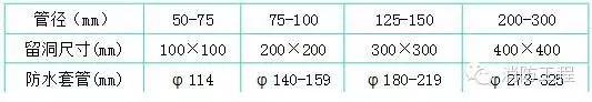 3.嚴(yán)格按照標(biāo)準(zhǔn)圖集加工制作防水套管、穿墻套管,套管長度按結(jié)構(gòu)施工圖尺寸確定,套管管徑參照下列標(biāo)準(zhǔn):