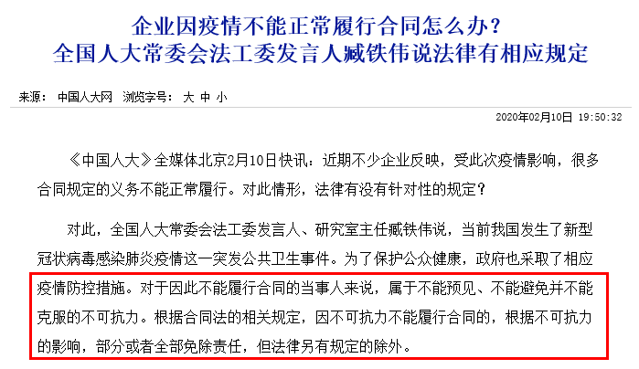 全國(guó)人大法工委:新冠肺炎疫情屬于不可抗力!