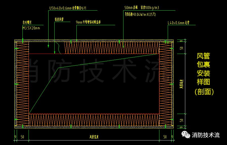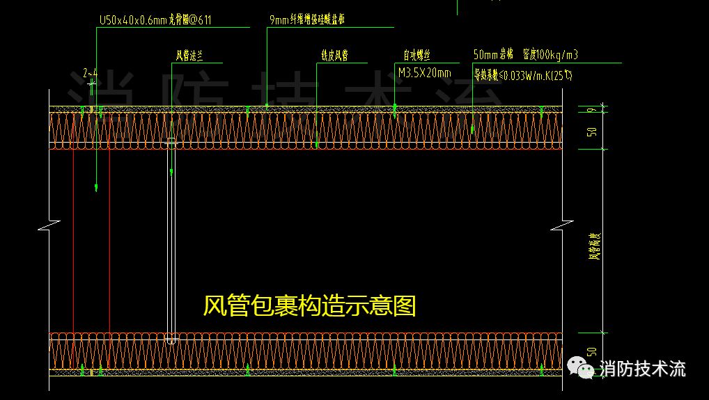 3、耐火極限不小于1h的風管(如不在吊頂內水平設置的加壓風管、內走道及非機動車庫排煙管),外表面作防火包裹處理。包裹材料:9mm纖維增強硅酸鹽防火板+50mm巖棉。