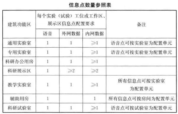 (3)在通用實驗室、專用實驗室、科研辦公用房、科研展示區(qū)、教學實驗室及輔助用房、科研試驗室內(nèi)應設置語音、數(shù)據(jù)信息點。信息點數(shù)量宜符合下表的規(guī)定。