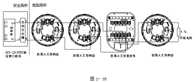 GST-LD-8332模塊箱可與防爆的感溫火災探測器、感煙火災探測器及手動火災報警按鈕一起接入火災報警控制器系統中組成本安型防爆系統。在系統連線末端必須連接一4.7kΩ終端電阻,且一只編址接口模塊混接的各類防爆探測器及報警探測不能超過10只。系統連線如圖1- 35所示。