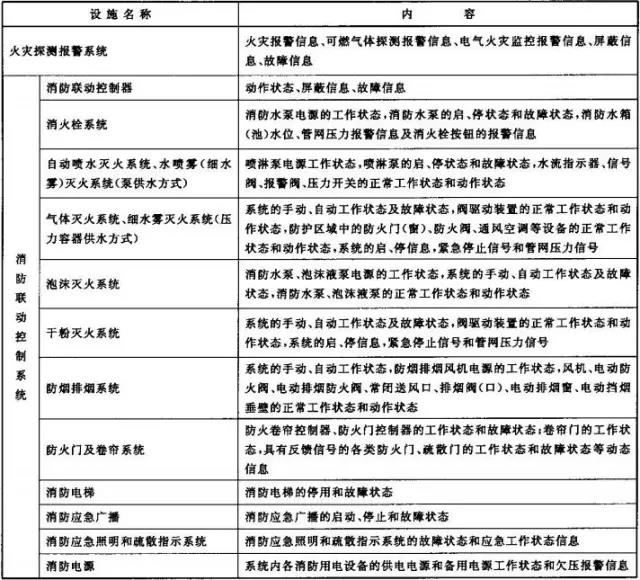 2、消防控制室內(nèi)設(shè)置的消防設(shè)備應(yīng)能監(jiān)控并顯示建筑消防設(shè)施運行狀態(tài)信息,并應(yīng)具有向城市消防遠(yuǎn)程監(jiān)控中心(以下簡稱監(jiān)控中心)傳輸這些信息的功能。建筑消防設(shè)施運行狀態(tài)信息見下表1。