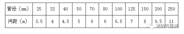 (4)自動(dòng)噴水滅火系統(tǒng)管道支、吊架選材及做法應(yīng)滿(mǎn)足要求,支吊架最大間距應(yīng)符合下表: