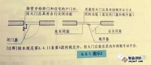 3.除管井檢修門和住宅的戶門外,防火門應(yīng)具有自行關(guān)閉功能。雙扇防火門應(yīng)具有按順序自行關(guān)閉的功能。【圖示2】