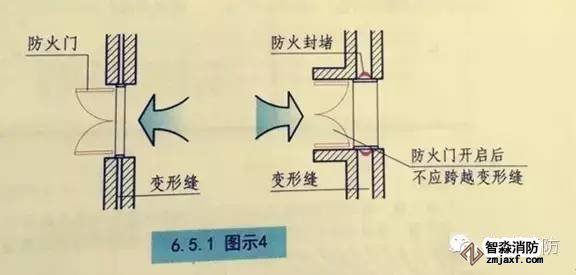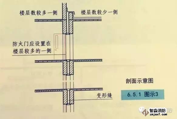 5.設(shè)置在建筑變形縫附件時(shí),防火門應(yīng)設(shè)置在樓層較多的一側(cè)【圖示3】,并應(yīng)保證防火門開啟時(shí)門扇不跨越變形縫。【圖示4】