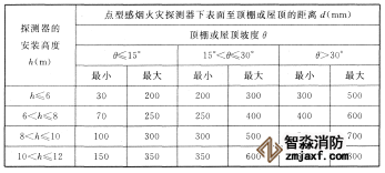 10、鋸齒形屋頂和坡度大于15度的人字形屋頂,應在每個屋脊處設置一排點型探測器,探測器下表面至屋頂最高處的距離應符合以上第9條的規定。
