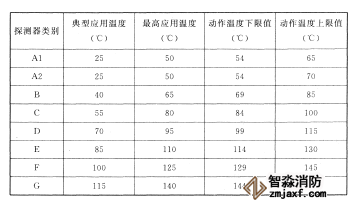 注:表中A1、A2、B、C、D、E、F、G為點型感溫探測器的不同類別,其具體參數應符合附錄一的規定。