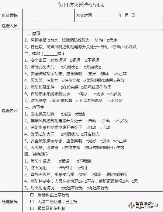 4、附表中各項目情況正常打“√”,存在問題或故障的打“×”;對發現的問題應及時處理,當場不能處置的要填報《建筑消防設施故障處理記錄》。