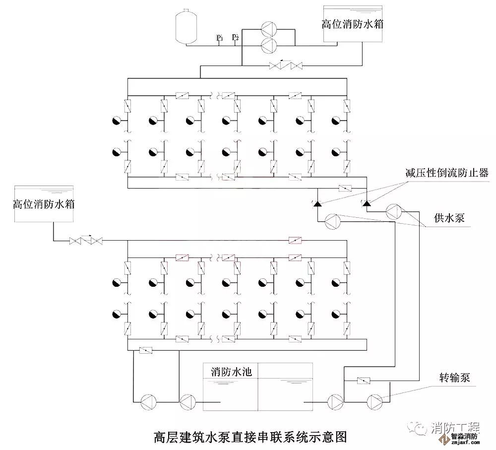 宜采用消防水泵轉輸水箱串聯供水方式,并應符合下列規定:
