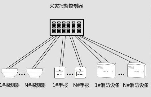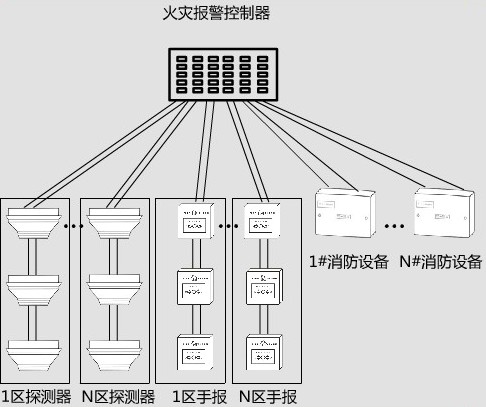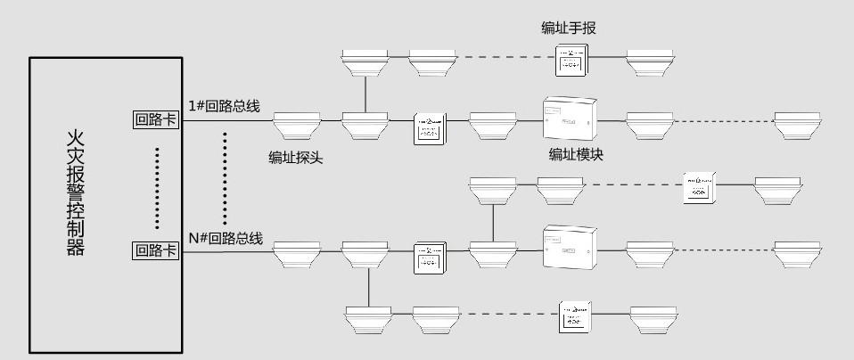 引入分區(將同一防火分區的檢測單元并接于控制器的一個輸入口)解決控制器輸入口不足及改善施工布線。火災報警只能報到防火分區,無法及時準確的報警到具體著火點。隨著建筑規模增大,防火分區和受控消防設備數量的不斷增加,依然難以滿足需求。