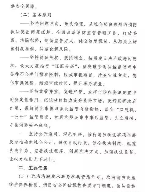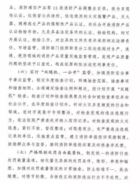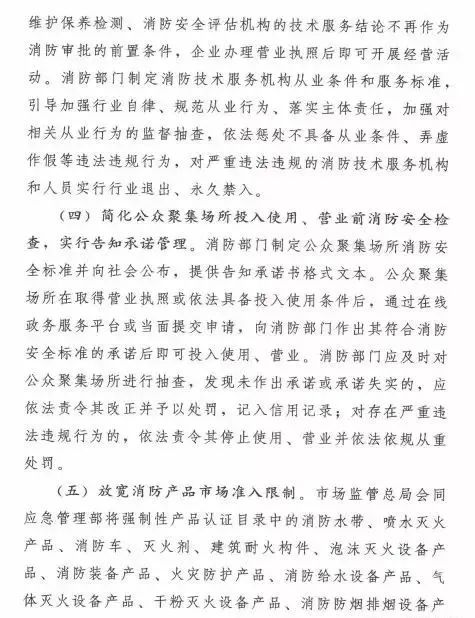 在簡(jiǎn)政放權(quán)方面,取消和精簡(jiǎn)3項(xiàng)消防審批。一是取消消防技術(shù)服務(wù)機(jī)構(gòu)資質(zhì)許可,取消消防設(shè)施維護(hù)保養(yǎng)檢測(cè)、消防安全評(píng)估機(jī)構(gòu)資質(zhì)許可制度,企業(yè)辦理營(yíng)業(yè)執(zhí)照后即可開(kāi)展經(jīng)營(yíng)活動(dòng)。二是簡(jiǎn)化公眾聚集場(chǎng)所投入使用、營(yíng)業(yè)前消防安全檢查,實(shí)行告知承諾管理,公眾聚集場(chǎng)所作出其符合消防安全標(biāo)準(zhǔn)的承諾后即可投入使用、營(yíng)業(yè)。三是放寬消防產(chǎn)品市場(chǎng)準(zhǔn)入限制,將強(qiáng)制性產(chǎn)品認(rèn)證目錄中的13類消防產(chǎn)品調(diào)整出目錄,改為自愿性認(rèn)證,僅保留公共場(chǎng)所、住宅使用的火災(zāi)報(bào)警產(chǎn)品、滅火器、避難逃生產(chǎn)品的強(qiáng)制性產(chǎn)品認(rèn)證;向社會(huì)開(kāi)放消防產(chǎn)品認(rèn)證、檢驗(yàn)市場(chǎng),凡是具備法定條件的認(rèn)證、檢驗(yàn)機(jī)構(gòu),均可開(kāi)展認(rèn)證、檢驗(yàn)工作。消防部門制定消防技術(shù)服務(wù)機(jī)構(gòu)從業(yè)條件和服務(wù)標(biāo)準(zhǔn)、公眾聚集場(chǎng)所消防安全標(biāo)準(zhǔn),引導(dǎo)加強(qiáng)行業(yè)自律、規(guī)范從業(yè)行為,加強(qiáng)監(jiān)督抽查,依法懲處違法違規(guī)行為,對(duì)嚴(yán)重違法違規(guī)的實(shí)行行業(yè)退出、永久禁入或者責(zé)令停止使用、營(yíng)業(yè)。