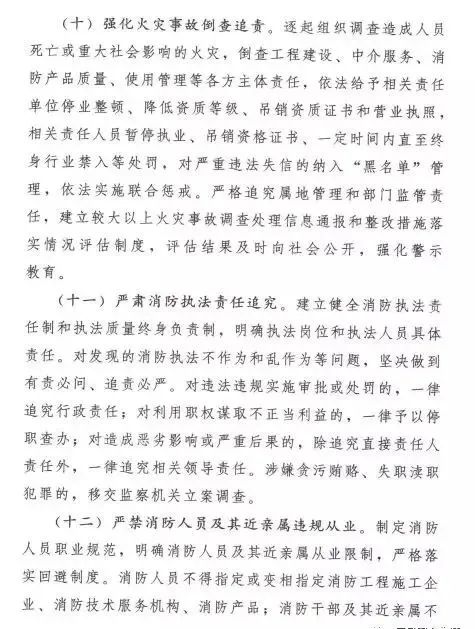 在加強(qiáng)事中事后監(jiān)管方面,實(shí)行“雙隨機(jī)、一公開(kāi)”監(jiān)管,明確抽查范圍、抽查事項(xiàng)和抽查細(xì)則,合理確定抽查比例和頻次;針對(duì)火災(zāi)多發(fā)頻發(fā)的行業(yè)和領(lǐng)域,適時(shí)開(kāi)展集中專項(xiàng)整治,對(duì)隱患突出、有嚴(yán)重違法違規(guī)記錄的單位,實(shí)施重點(diǎn)監(jiān)管;建立消防舉報(bào)投訴獎(jiǎng)勵(lì)制度,鼓勵(lì)群眾參與監(jiān)督;將消防違法違規(guī)行為記入信用記錄,嚴(yán)重違法失信企業(yè)納入“黑名單”管理,依法實(shí)施聯(lián)合懲戒;完善“互聯(lián)網(wǎng)+監(jiān)管”,運(yùn)用物聯(lián)網(wǎng)和大數(shù)據(jù)技術(shù),實(shí)時(shí)化、智能化評(píng)估消防安全風(fēng)險(xiǎn),實(shí)現(xiàn)精準(zhǔn)監(jiān)管;強(qiáng)化火災(zāi)事故倒查追責(zé),逐起組織調(diào)查造成人員死亡或造成重大社會(huì)影響的火災(zāi),倒查工程建設(shè)、中介服務(wù)、消防產(chǎn)品質(zhì)量、使用管理等各方主體責(zé)任,嚴(yán)肅責(zé)任追究。