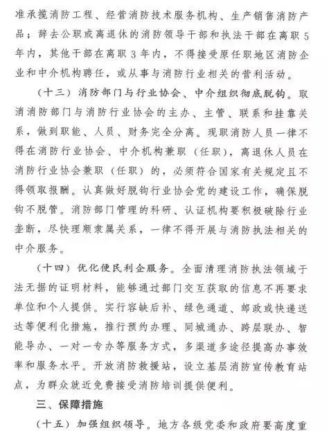 在執(zhí)法隊(duì)伍管理方面,制定消防人員職業(yè)規(guī)范,明確消防人員及其近親屬?gòu)臉I(yè)限制,嚴(yán)格落實(shí)回避制度。消防部門與消防行業(yè)協(xié)會(huì)、中介組織徹底脫鉤。現(xiàn)職消防人員一律不得在消防行業(yè)協(xié)會(huì)、中介機(jī)構(gòu)兼職(任職),離退休人員在消防行業(yè)協(xié)會(huì)兼職(任職)的,必須符合國(guó)家有關(guān)規(guī)定且不得領(lǐng)取報(bào)酬。消防部門管理的科研、認(rèn)證機(jī)構(gòu)一律不得開(kāi)展與消防執(zhí)法相關(guān)的中介服務(wù)。