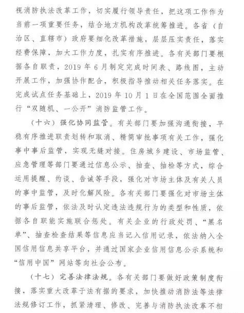 《意見(jiàn)》還從加強(qiáng)組織領(lǐng)導(dǎo)、強(qiáng)化協(xié)同監(jiān)管、完善法律法規(guī)、抓好督促落實(shí)4個(gè)方面提出了深化消防執(zhí)法改革的保障措施。