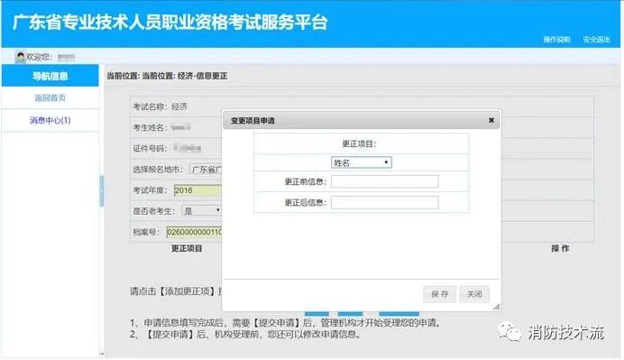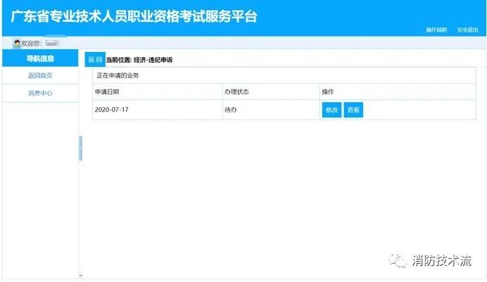 3.消息查看。申請的業務有新的反饋動態時,例如申請已受理、申請已辦結、申請需要修改補充材料等,左側【導航信息】菜單中的【消息中心】中會有閃動提示,并且顯示新信息條數,例如【消息中心(1)】。