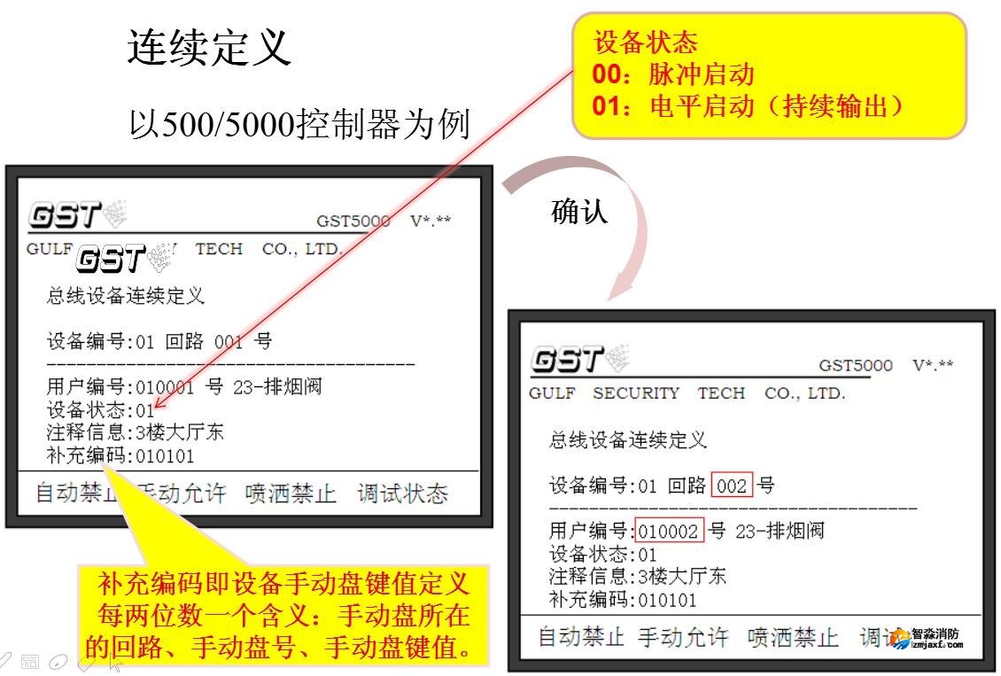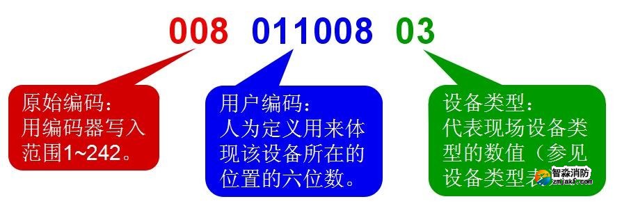 控制器所接的可編址外部設備均需進行編碼設定,每個設備對應一個原始編碼(一次碼,如下圖紅色數字)和一個用戶編碼(二次碼,如下