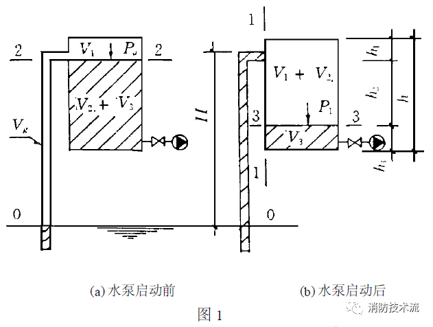 泵啟動(dòng)后,液面下降,達(dá)到穩(wěn)定運(yùn)行工作后,罐內(nèi)應(yīng)存有一定體積量V3的水,而氣體之外的罐內(nèi)空氣體積為V1+V2。罐內(nèi)部的壓力為P1,壓力小于外界大氣壓力Pa。