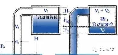 水泵啟動(dòng)前,真空引水罐內(nèi)的水應(yīng)灌至真空引水罐能做到的大存水量,此時(shí)罐內(nèi)部由水+空氣兩部分構(gòu)成,液面上方的氣體容積為V1。罐內(nèi)外的壓力與大氣壓力Pa相同。