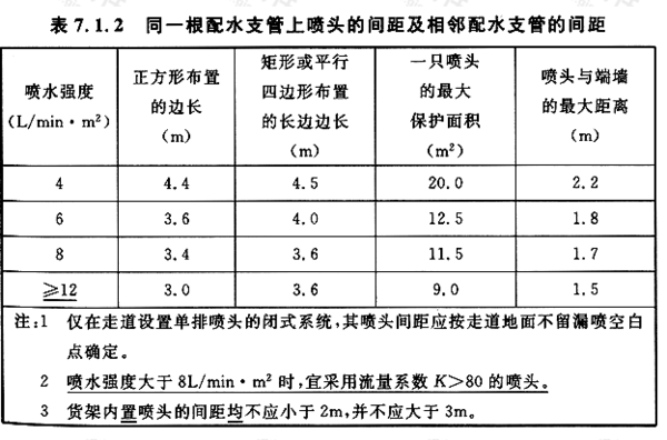 7.1.2直立型、下垂型噴頭的布置,包括同一根配水支管上噴頭的間距及相鄰配水支管的間距,應(yīng)根據(jù)系統(tǒng)的噴水強(qiáng)度、噴頭的流量系數(shù)和工作壓力確定,并不應(yīng)大于表7.1.2的規(guī)定,且不宜小于2.4m。