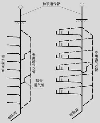 當建筑物層數和衛生器具較多時,因排水量大,空氣流動過程宜受排水過程干擾,須將排水管和通氣管分開,設專用通氣管道。