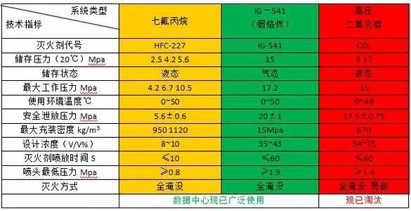 下文將針對數(shù)據(jù)中心機房中氣體滅火系統(tǒng)的選擇,講述七氟丙烷與IG541煙洛盡系統(tǒng)的對比。二氧化碳滅火系統(tǒng)會使人窒息,且在滅火過程中產(chǎn)生的殘留物對設(shè)備造成污染,現(xiàn)已很少出現(xiàn),本文只做簡單介紹。
