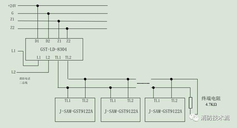 布線要求:Z1、Z2 采用截面積≥1.0mm2 的阻燃RVS雙絞線,DC24V電源線采用截面積≥1.5mm 2 的阻燃BV線,TL1、TL2、L1、L2 采用截面積≥1.0mm2 的阻燃RVVP屏蔽線。