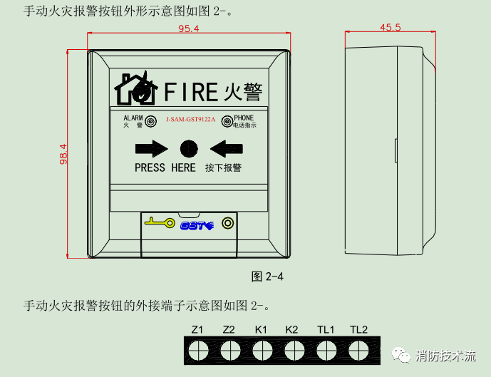 K1、K2:額定 DC30V/100mA 無源輸出端子,當報警按鈕按下時,輸出觸點閉合信號,可直接控制外部設備。