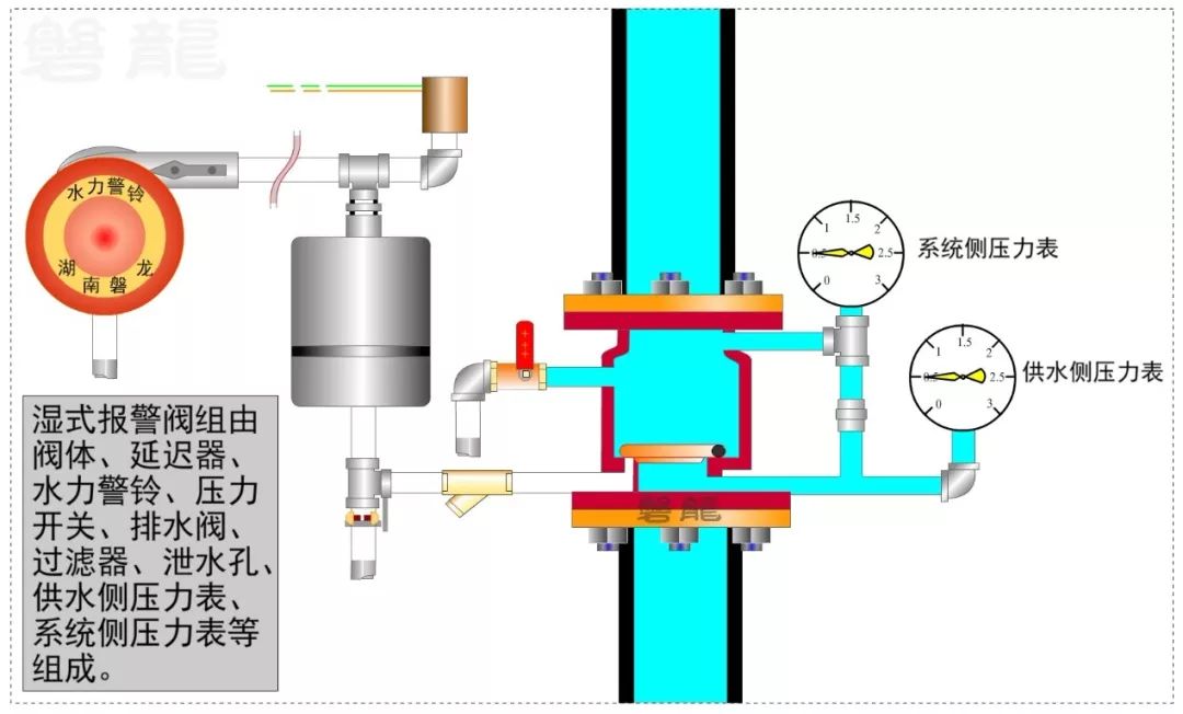 2、濕式報警閥的供水側和系統側都設置有壓力表,系統側壓力表指示系統側出口壓力,供水側壓力表指示供水側入口壓力。